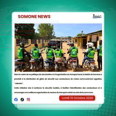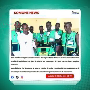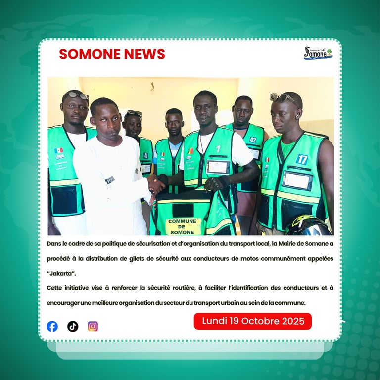 Dans le cadre de sa politique de sécurisation et d’organisation du transport local, la Mairie de Somone a procédé ce lundi 19 octobre 2025 à la distribution de gilets de sécurité aux conducteurs de motos communément appelées “Jakarta”.