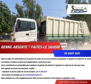 La Commune de Somone place la protection de l’environnement et l’amélioration du cadre de vie au cœur de ses priorités. Nous appelons tous les citoyens à s’engager à nos côtés pour bâtir une ville propre, saine et durable.Gestion des déchets